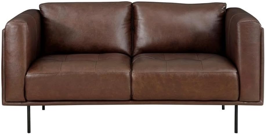 The ultra-modern design of the Soren Collection is a stunning reflection of the sophisticated style that defines your personal space. The low-back profile of the seating arrangement gives an uninterrupted view of your surroundings from top to bottom, the open design enhanced by the supporting metal legs. Brown top-grain leather covers the love seat where the hand touches, with split-leather match covering the remaining surface.Features:- Materials: Plywood, solid wood, leather- Finish: Brown- High-density foam seat cushion- 100% Top grain leather where the body touches, all else split leather- Attached back and seat cushion- Metal legs with espresso finish- Tufted detail- Frame Construction/Joinery: ScrewedSpecifications:- Product Dimensions: 30.5"H x 63"W x 36"D- Product Weight: 100.25 lbs- Seat Dimensions: 18"H x 49.5"W x 22.5"D- Arm Height: 29.5"- Product Width: (Doorway) 23.5"- Weight Capacity: 300 lbs